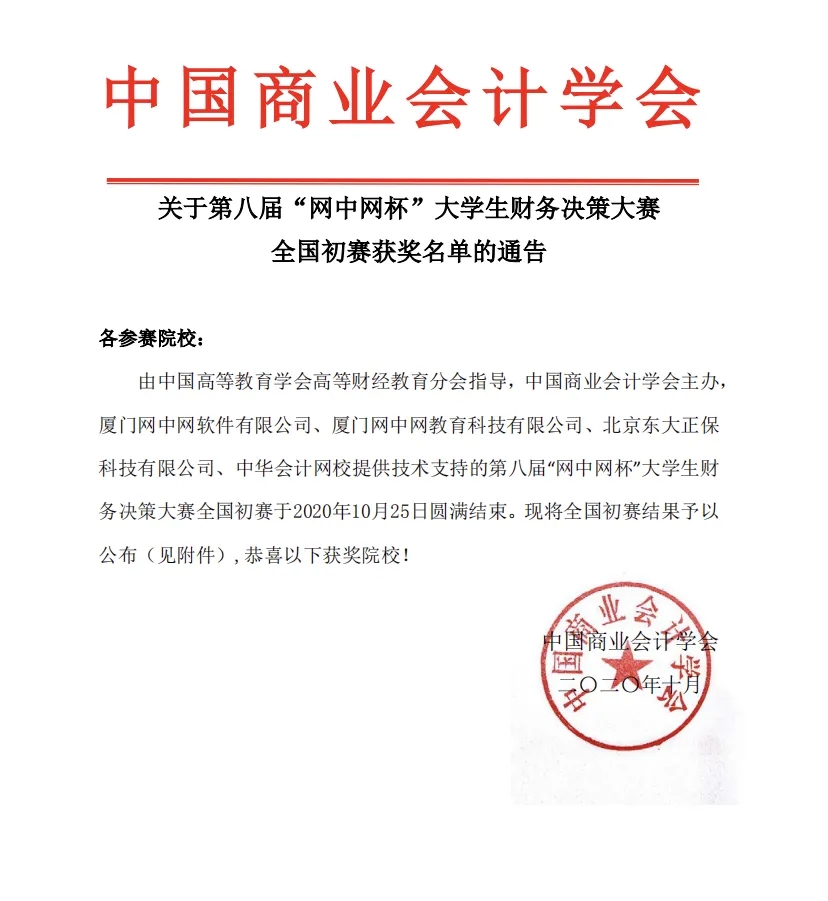 2020年10月,由中国高等教育学会高等财经教育分会主办,厦门网中网软件有限公司、厦门网中网财务技术有限公司承办的“网中网杯”大学生财务决策大赛大区赛圆满结束。本次大赛由来自全国的三百多所院校参加了比赛,我校代表队凭借出色的发挥,获得第八届“网中网杯”东区财务决策大赛一等奖,成功晋级全国总决赛。
