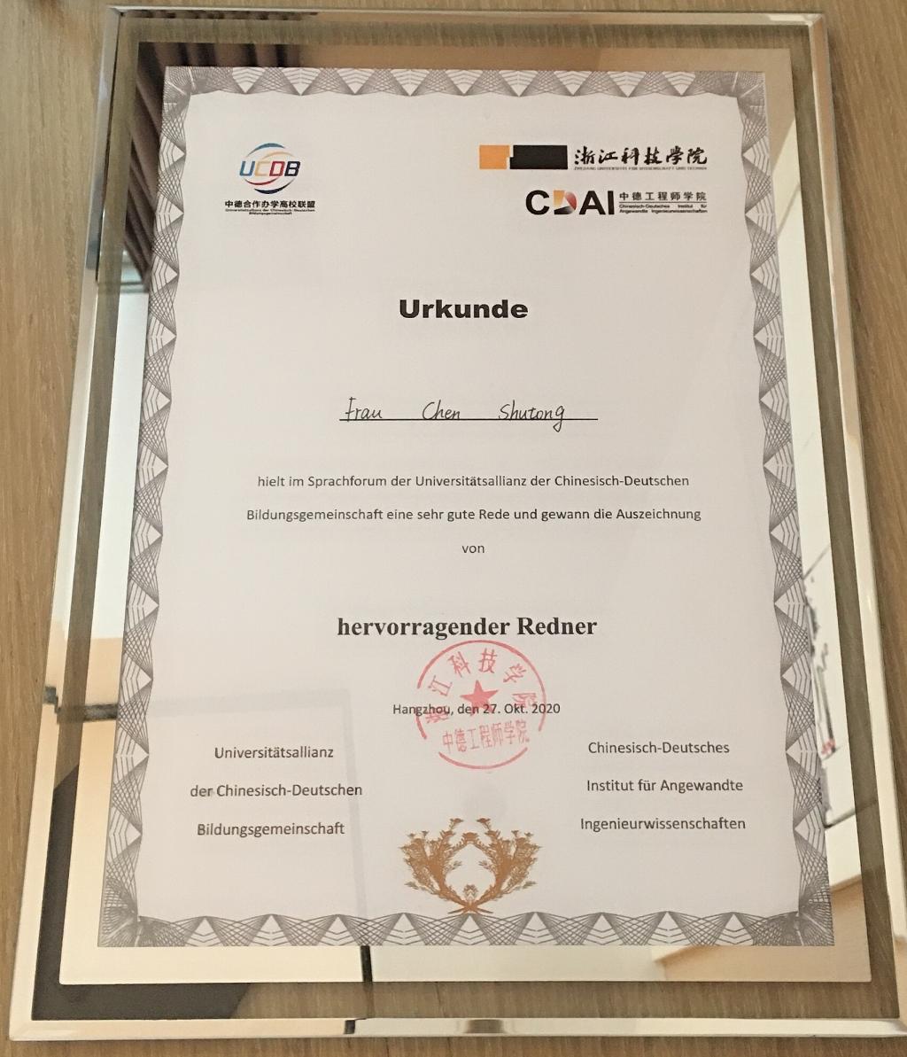 2020年10月28日,全国中德合作办学高校联盟举办的第一届非德语专业学生的德语演讲比赛在浙江科技学院举行。2019级国际教育交流学院中德班陈姝彤同学代表我院参赛并获得“杰出演讲者”奖项。