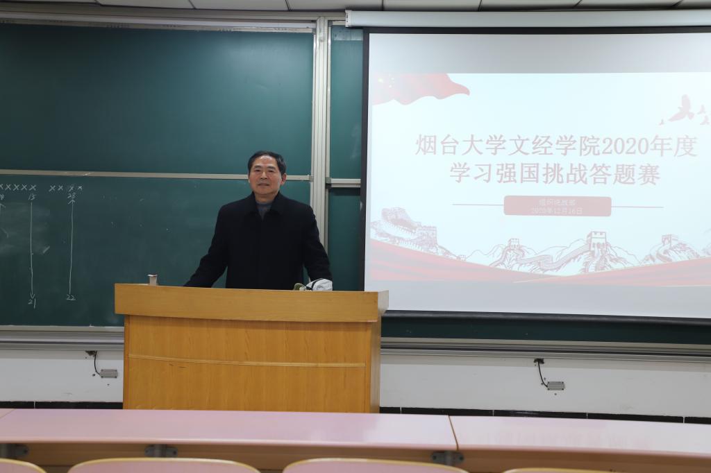 为深入学习贯彻习近平新时代中国特色社会主义思想,进一步扩大“学习强国”学习平台影响力,12月16日下午,烟台大学文经学院2020年度学习强国挑战答题赛于二教507教室举行。学院副院长张仁杰,组织统战部部长张琼玉出席。