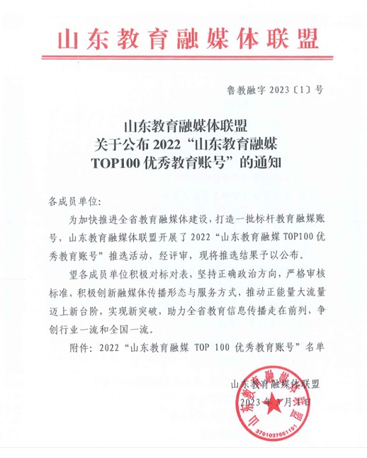 3月1日,山东教育融媒体联盟发布《关于公布2022“山东教育融媒TOP100优秀教育账号”的通知》。烟台理工学院微信公众号获评“2022山东教育融媒TOP100优秀教育账号”。