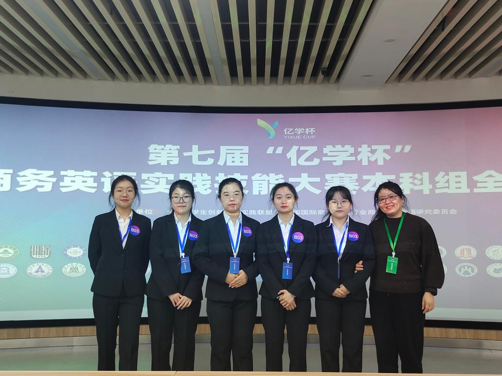 11月26日,我校学子在第七届“亿学杯”全国商务英语实践技能大赛全国总决赛中再创佳绩。由外国语学院卢洁芳、李金红老师指导的外2104-1班代表队(刘俊婷、杜雨晴、尹涛涛、张晓纯和冯皙茹)荣获本科组全国总决赛三等奖。由贺婷婷、潘晓琳老师指导的外2111-2班代表队(白一凡、刘妍)以及外2111-1班代表队(李晓华、李祥敏和刘静)荣获高职组全国总决赛二等奖。