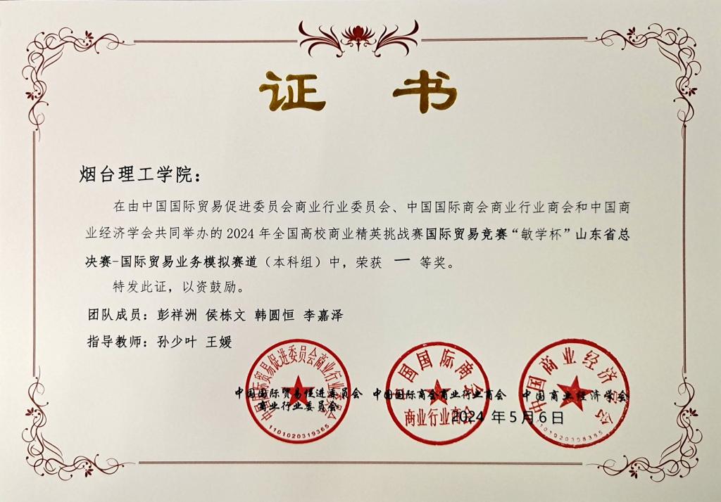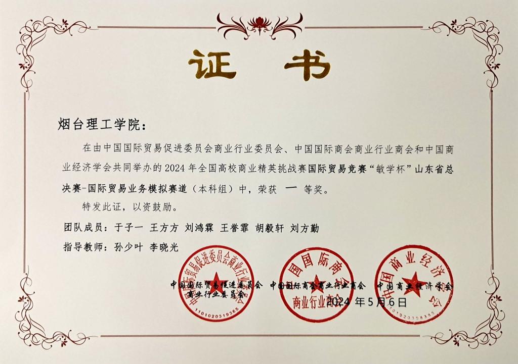 近日,由中国商业经济会等单位主办的2024年全国高校商业精英挑战赛国际贸易竞赛(国际贸易业务模拟赛道)山东省总决赛圆满落幕。经过激烈角逐,我校在此次竞赛中表现出色,荣获本科组一等奖3项,专科组三等奖1项。