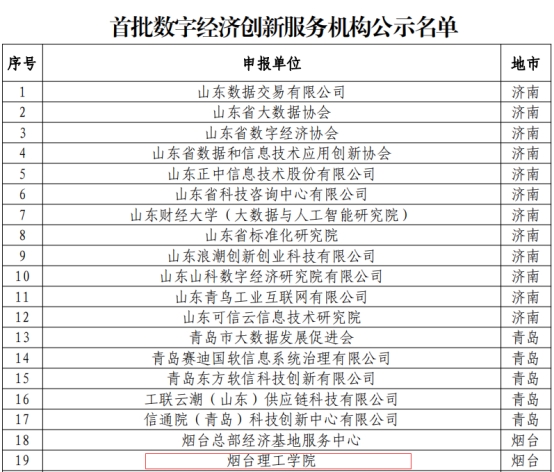 山东省工业和信息化厅近日发文《关于公布首批山东省数字经济创新平台名单的通知》(鲁工信数据〔2024〕114号),公布了首批山东省“数字经济”创新平台项目单位名单,主要包括数字经济创新实验室、数字经济产业创新中心、数字经济创新服务机构、数字经济创新人才基地等4类平台立项。其中,烟台理工学院成功入选山东省首批数字经济创新服务机构,实现了学校省级科研创新平台建设的又一次突破,开创了学校面向“人工智能+”新工科科研工作新的里程碑!