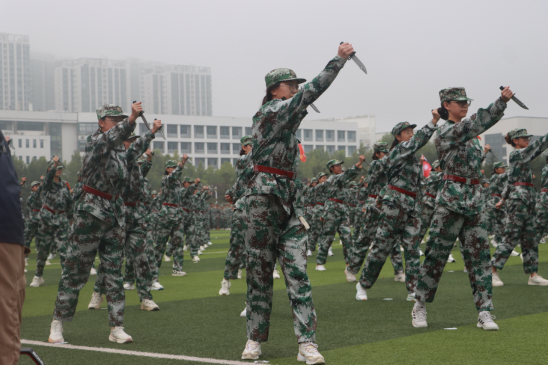 大会在庄严的国歌声中拉开帷幕。五星红旗冉冉升起,声声国歌高亢嘹亮。各学院方阵步履铿锵,昂首阔步,彰显了烟理工新生不屈不挠的坚毅精神。刺杀操方阵出枪刚劲,威震八方,挺直的腰板,敏捷的身姿,一招一式尽显烟理工学子的力量与勇敢;军体拳方阵动作整齐划一、干净利落,挥拳时拳风呼啸,带着勇往直前的气势,展现出烟理工学子的自信与豪迈;匕首操方阵刀起飒爽,刀落坚定,动作有力又不失柔美,刚劲并存,变换如行云流水,传递出烟理工学子巾帼不让须眉的英雄气势。
