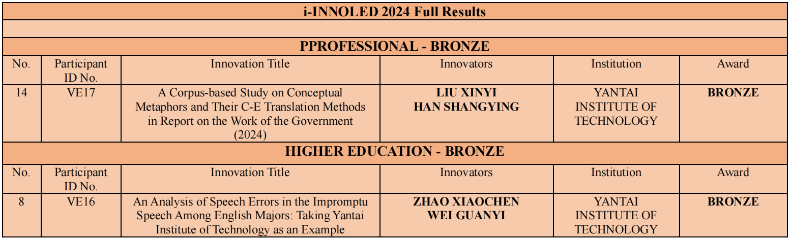 在刚刚落幕的2024年国际语言与教育创新竞赛(International Language and Education Innovation Competition)中,我校外国语学院2002-1班刘欣怡同学(指导教师:韩尚颖)和2002-4班赵笑晨同学(指导教师:魏冠艺)分别荣获专业类别(Professional)和高等教育类别(Higher Education category)铜奖(Bronze Prize)。这是我校学生首次参与国际教育创新比赛并荣获奖项。该竞赛由马来西亚伊斯兰科学大学(Universiti Sains Islam Malaysia, USIM)主办,吸引了来自全球的众多优秀师生参加。