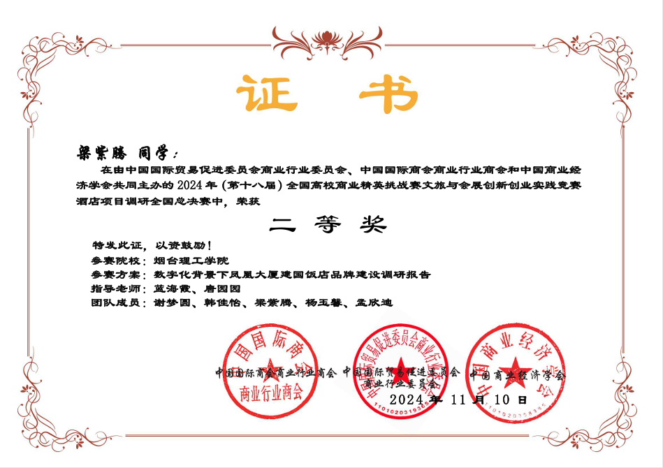 近日,第十八届全国高校商业精英挑战赛文旅与会展创新创业实践竞赛全国总决赛圆满落下帷幕。经济管理学院学生许亦婷、任天宇、荆煜焜、张语嘉与建筑工程学院学生白新明组成的星辰大海团队在殷晓彦、王崇红两位老师的指导下不断打磨作品,历经层层选拔,在全国总决赛中取得了一等奖的优异成绩。