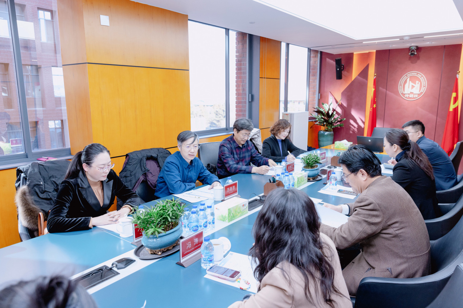 随后,外研社的冯涛、鞠慧、周婉婉、曹群分别就高等英语教材出版与综合服务、国际中文教材及人文社科项目情况、职业教育教材资源与教学服务、高等领域数字化解决方案等议题进行了精彩分享。徐惠忠、于巧丽、郭亚奇就外语教育数字化转型、外语教育垂类大模型应用与平台建设、教师科研项目申报、课程建设等方面与外研社相关部门领导展开了深入交流。会谈中,双方还就战略合作框架协议的具体内容进行了深入探讨。
