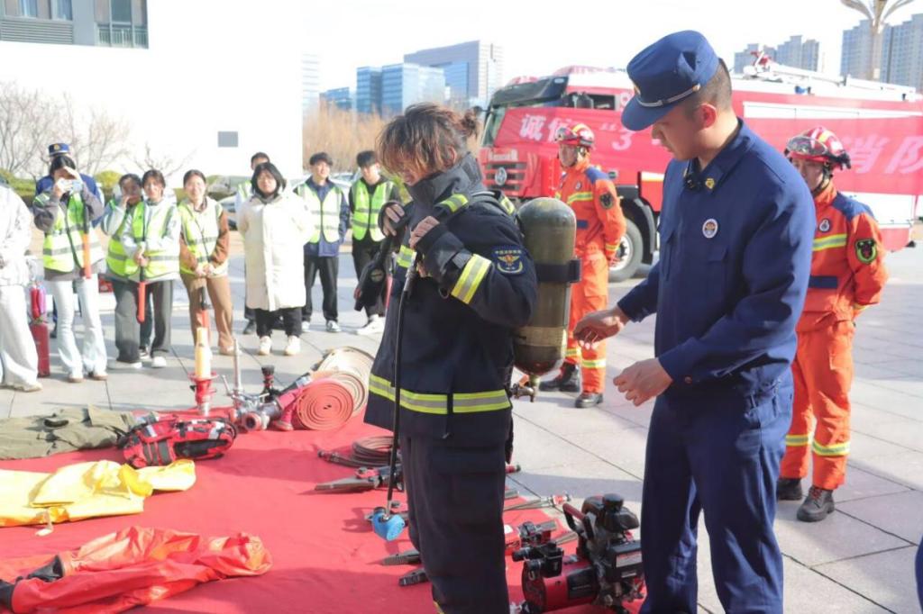 讲座过后,开展模拟火灾逃生演练,参观了消防器材和消防车。消防员们现场给大家示范了各类救援和灭火器材的使用方法。