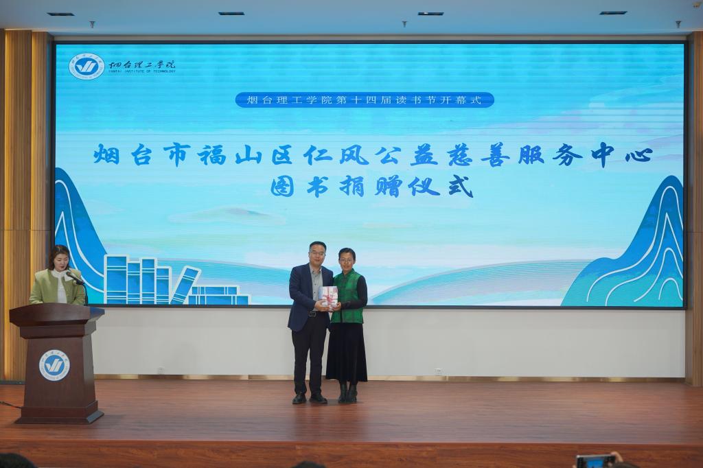 会上,校领导共同为第十四届读书节启幕。烟台市福山区仁风公益慈善服务中心向学校捐赠2000册新书,徐雪峰助理代表学校为其颁发捐赠证书。