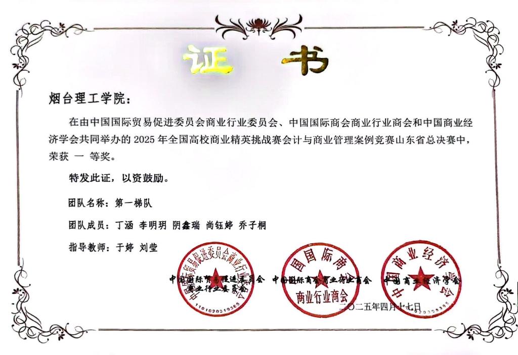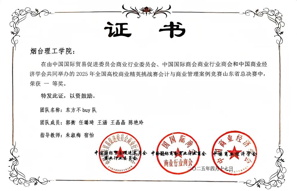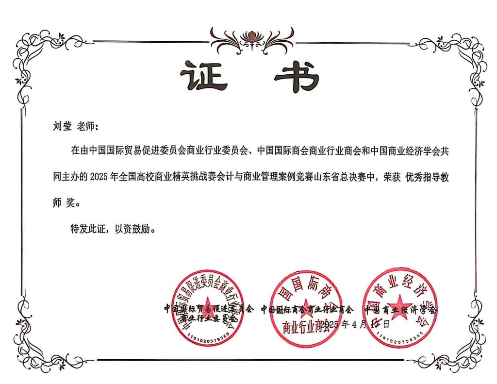近日,2025年全国高校商业精英挑战赛会计与商业管理案例竞赛圆满落幕。经过激烈角逐,荣获全国二等奖三项及山东省赛事一等奖三项。指导教师郑秀丽、刘莹荣获“优秀指导教师”称号。