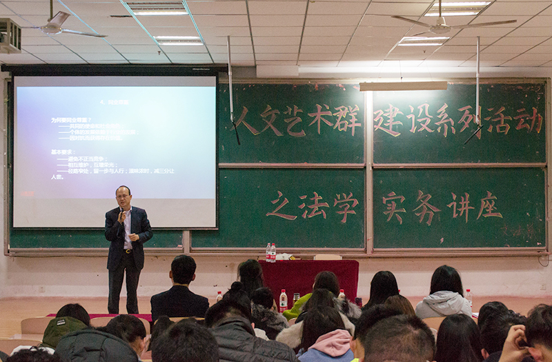 11月17日下午在2教115教室,文法系邀请曾获“全国优秀律师事务所”殊荣的山东鑫士铭律师事务所主任、中华全国律师协会理事、山东省政协委员,山东省人民政府法律专家库成员、山东省律师协会副会长刘学信,作法律实务讲座。文法系主任汤唯及法学专业课老师出席讲座,文法系17级和15级法学学子认真聆听讲座。法学教研室主任吴淑霞主持。
