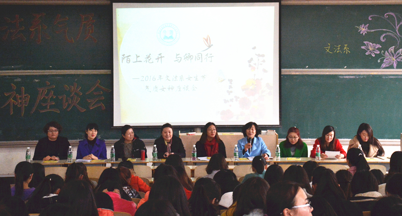 3月7日是校园女生节,在全国高校纷纷为女生庆祝同时,我院女生则收到了一份特殊的“福利”。当日下午,文法系于一教201举办了女生节气质女神座谈会,学院党委副书记李荣梅、文法系党支部书记王淑霞、文法系副主任董新红、文法系副教授刘大玮等九位“女神”老师与全体女学生干部及各年级女生代表齐聚一堂,讲述她们的故事,聆听她们的声音。座谈会由文法系党支部书记王淑霞主持。