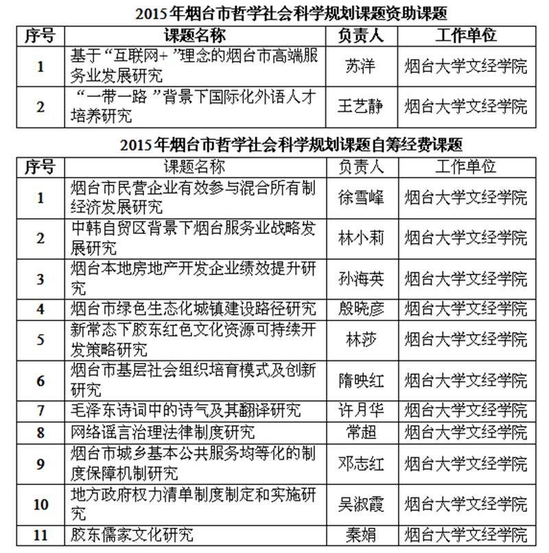 近日,烟台市社会科学联合会传来喜讯,我院申报的20项“2015年度烟台市哲学社会科学规划课题”中有13项获准立项。其中2项为资助项目,11项为自筹经费项目。