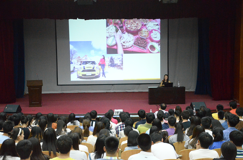 针对大学生普遍关注的出国问题,她简明扼要地介绍了出国流程,并同现场观众分享了她考取托福及GRE(美国研究生入学考试)的心得与体会,她希望自己的经验能够对场下观众起到借鉴与指导作用。