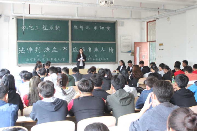 此次比赛的辩题为“法律判决应不应该考虑人情”。在双方简洁的自我介绍后,比赛正式开始。正方认为“法律判决应该考虑人情”,并提出了“法律的本源是人情”,“人有情,法律也有情”,“法律具有教育作用”等语句来证明自己的观点;而反方认为“法律判决不应该考虑人情”,举出“天子犯法,与庶民同罪”,“以情代法,必然以情乱法”等语句反驳。双方选手在公辩、自由辩等环节中思路清晰,引经据典,字字珠玑,使现场气氛迅速升温。最终反方获得此次辩论赛的胜利。