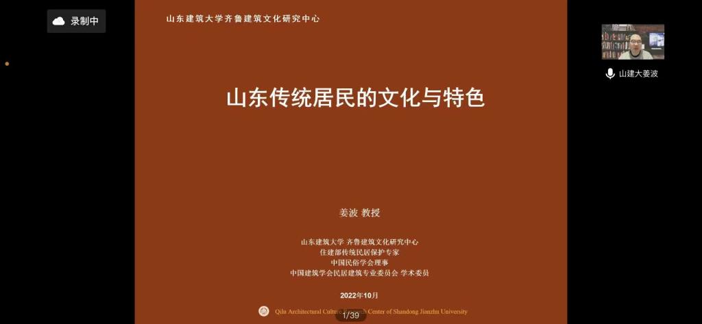 10月20日晚,山东建筑大学齐鲁建筑文化研究中心姜波教授应建筑工程学院的邀请,以线上形式召开“设计+”系列专题分享会之山东传统民居及文化特色。此次会议面向视觉传达设计、环境设计、建筑学三个专业,旨在实现应用型本科课程的建设,深入多元化课程教学改革,进一步弘扬中国传统民居及文化特色的普及,使传统文化融于设计理念。