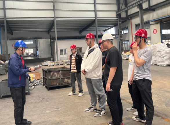 山东鲁电线路器材有限公司杨明圣老师为学生进行了安全教育和公司情况介绍。学生分成四组,在山东鲁电工作人员的带领下前往不同的车间和实验室参观学习,企业导师为学生进行专业讲解:在铸造车间了解电路器材铸造过程和铸造工艺;在冲压、锻压车间熟悉冲压、锻压工艺和装备;模具车间观看模具的加工过程;检验实验室熟悉尺寸检验、力学性能试验等检验流程。