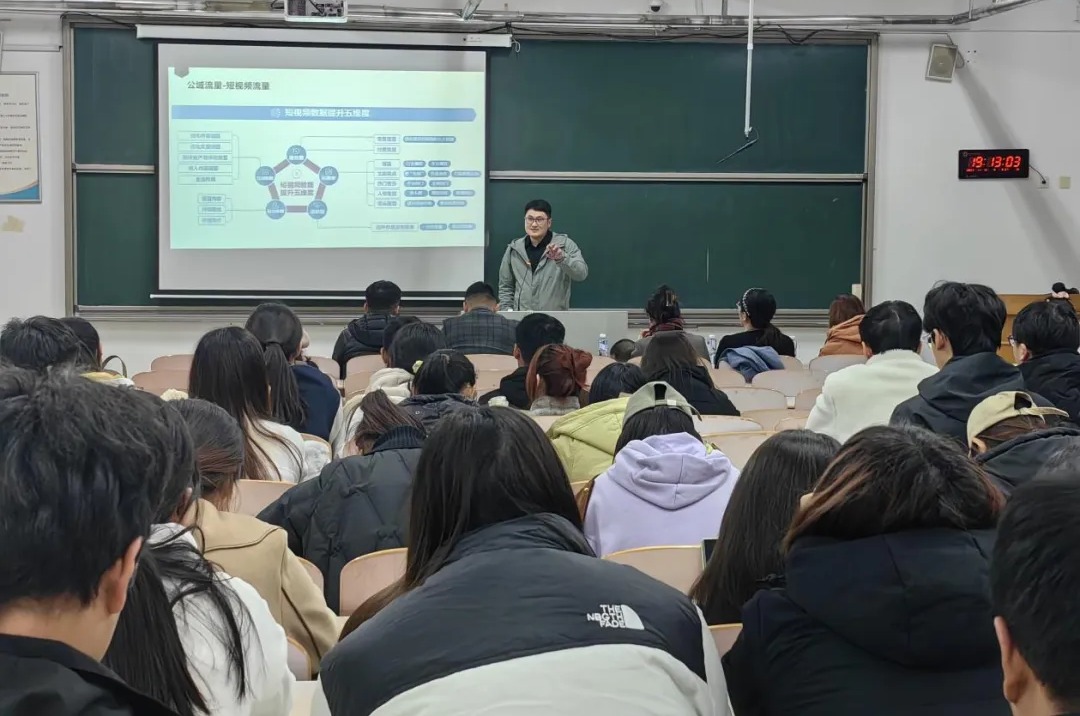 11月10日晚,文法学院MCN孵化基地于二教303举办第三次创新创业讲堂。本次讲堂邀请抖音电商易动文化的资深讲师对直播带货切片短视频制作和推广进行授课。文法学院副院长郭亚奇、网络与新媒体系全体教师及MCN孵化基地全体成员参加了本次讲堂活动。