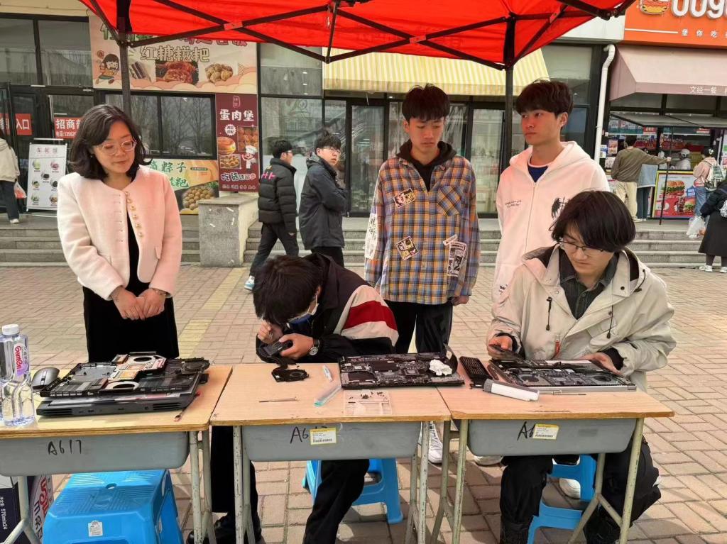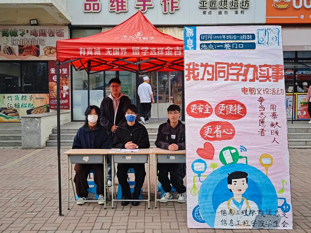 为切实解决师生使用电脑过程中的问题,培养学生社会责任感,发挥专业优势,提升实践动手能力,3月28日,由信息工程学院主办的“电脑义诊入校园,信息数字建温情”电脑义诊活动在一餐门口举办。