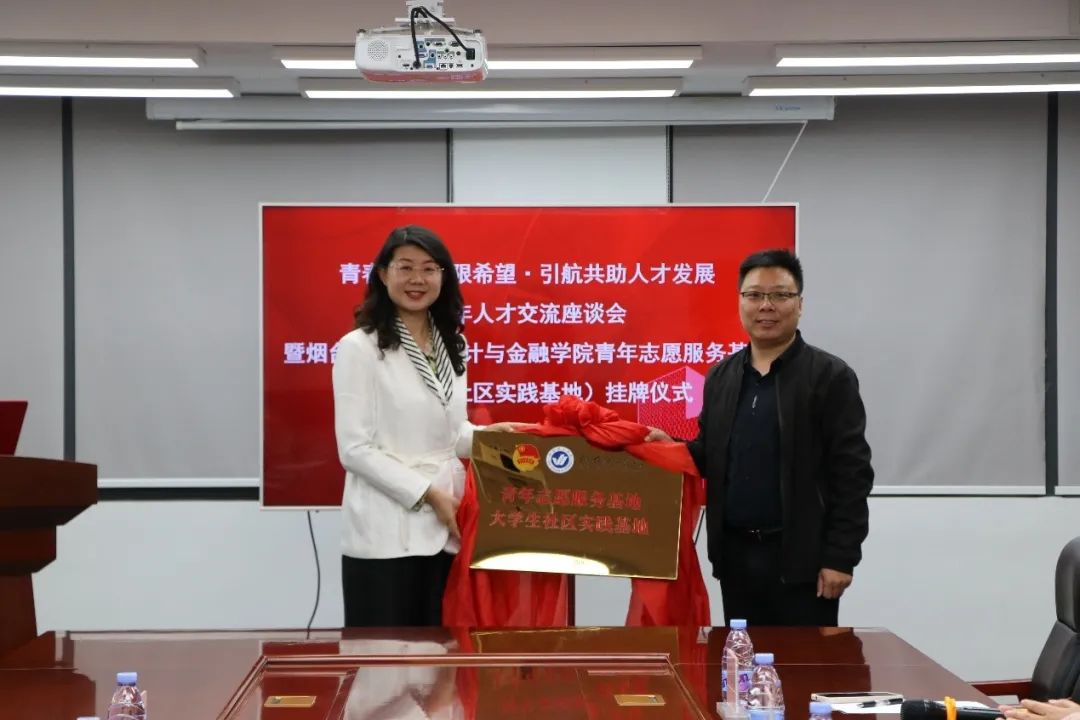 烟台市微泉青少年事务服务中心理事长王才生、会计与金融学院党总支书记申海滨共同为烟台理工学院青年志愿服务基地大学生社区实践基地进行揭牌。