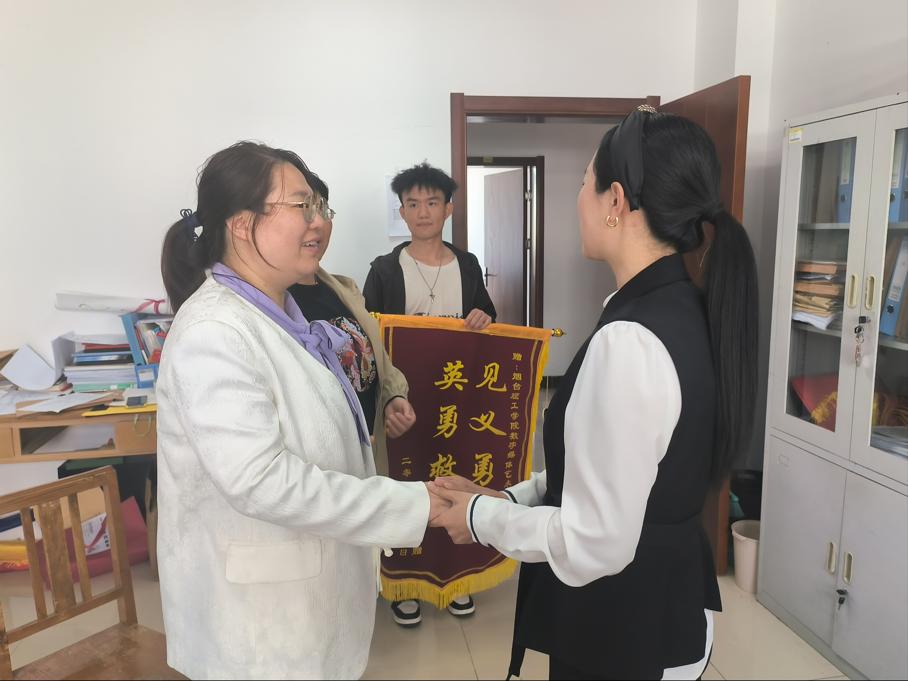 5月15日下午,一女童家长专程来到建筑工程学院,送来锦旗感谢见义勇为的王运佳同学,院长辛翠香,副院长田娜,团总支副书记孙中惠进行热情接待。