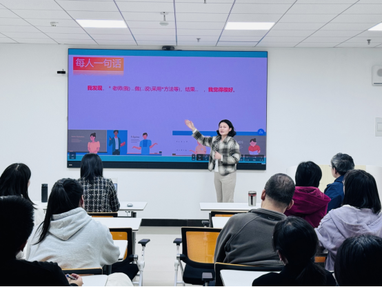 会议借鉴参与式教学模式,以“每人一句话”活动为主要形式,鼓励每位教师在会上积极发言,针对近期观摩课及自己在授课过程中遇到的问题展开深入讨论。教师们通过集体反思,互相学习,分享各自的教学经验和心得体会。活动中,大家不仅对他人课堂中的亮点进行了肯定和学习,也针对自己的教学方法进行了批判性反思,找出了自己在教学过程中尚待改进的地方。