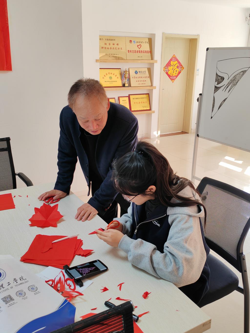 为弘扬中华优秀传统文化,营造全社会共同参与非遗传承和保护的浓厚氛围,丰富群众文化生活,11月8日,外国语学院剪艺志愿服务队在指导老师郭亚军的带领下携手万光府前社区党委开展社区双报到活动,共同领略剪纸艺术的独特魅力,感受这份流传千年的指尖艺术。