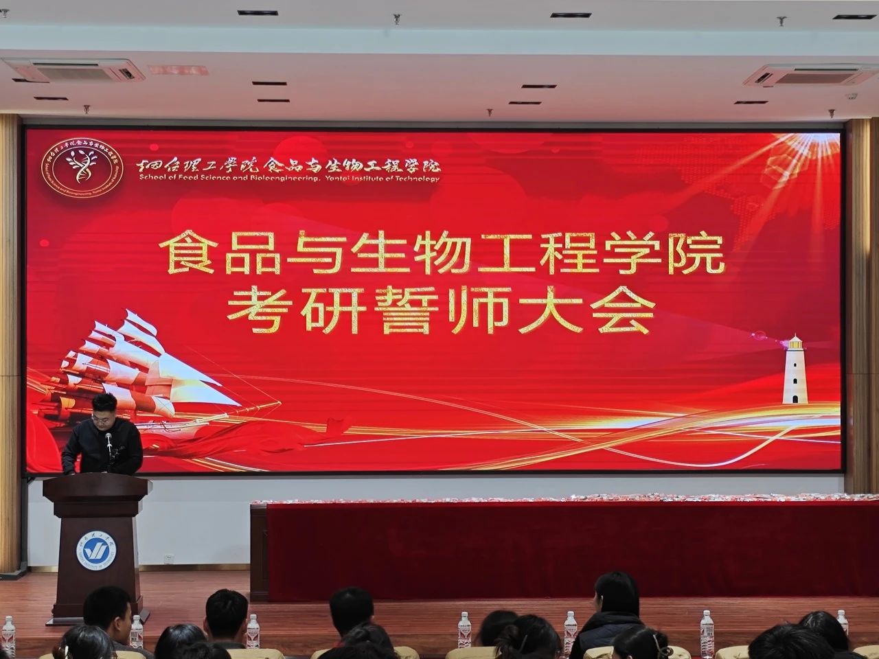 为了激发考研学子斗志,增强学生备考信心,鼓舞学生考研士气,食品与生物工程学院于12月13日下午在综合楼六楼报告厅举行了考研誓师大会,参加本次会议的有食品与生物工程学院党总支副书记温少斐,团总支书记王晶,全体辅导员、毕业班班主任及考研学子。会议由辅导员孙钰涵主持。