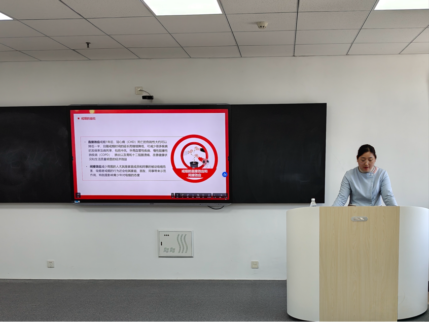 为进一步推进校园精神文明建设,倡导健康文明生活方式,提高学生对吸烟危害的认识和了解,4月23日,会计与金融学院于综合楼S203开展禁烟主题讲座,校医院张景兰老师主讲。校医院领导、老师,学院师生代表与会。
