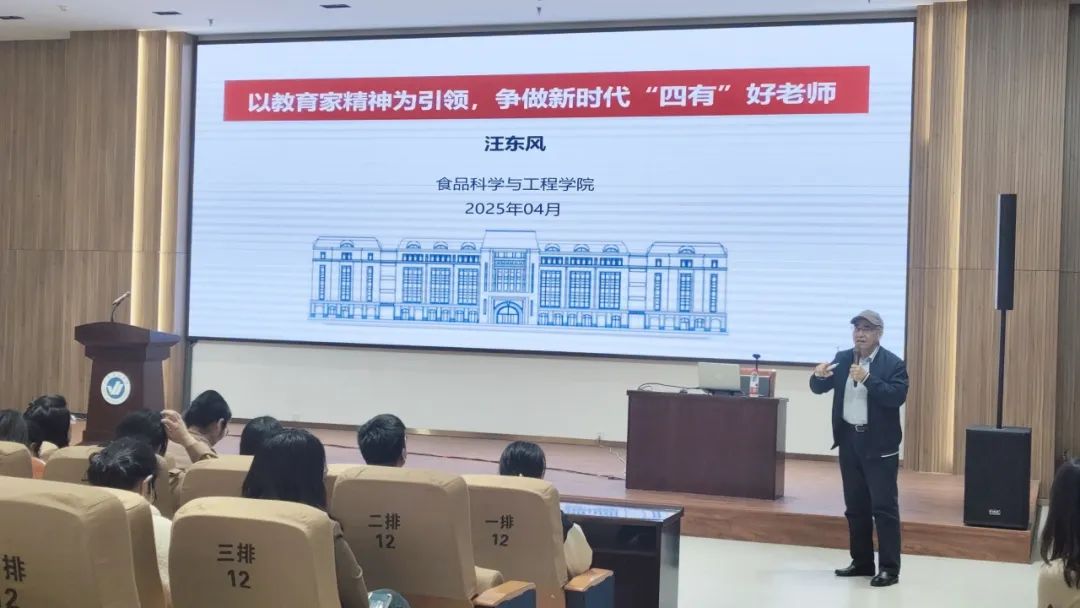 讲座中,汪东风教授以“以教育家精神为引领,争做新时代‘四有’好老师”为主题,围绕教育家精神与新时代教师队伍建设、争做“四有”好老师的实践路径、教学科研协同发展等维度展开分享。他凭借深厚的教育理论与丰富的一线教学经验,深入阐释教育家精神内涵及其与“四有”好老师标准的内在联系,并从“上好每堂课”“编出好教材”“做强精品课”三个层面系统阐述育人方略。同时,汪教授以《食品化学》等国家级规划教材编写为例,强调课程建设需注重知识传授与能力培养的双向赋能,通过激发学生兴趣、培养自主学习能力、构建新型师生关系实现教学相长。汪教授还重点针对青年教师,结合案例提出“五点建议”与“四重提醒”,倡导以教育家精神涵养育人初心,鼓励教师在新时代教育使命中成长为兼具专业素养与育人情怀的教育工作者。