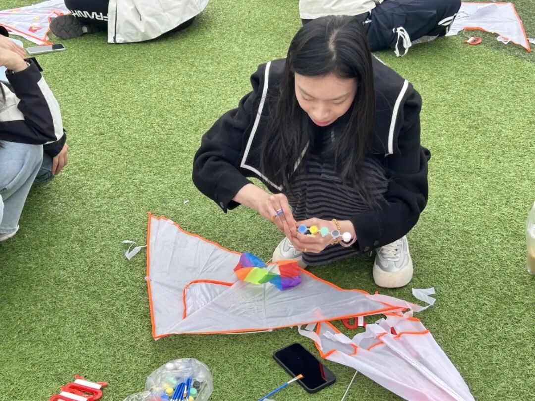 同学们在操场有序集合后,老师统一发放空白风筝。大家执起彩笔,将春日光景与心中期许细细描摹,一笔一画间,同学巧妙融入传统纹样与简易书法,既有美学的温润滋养,也悄然浸润着传统文化的淡淡韵味。风筝绘制完毕,师生们一同迎着春风放飞,奔跑放线间,筋骨舒展、体魄强健,连日来的学业疲惫随纸鸢升空,消散在澄澈晴空,心境也愈发轻快明朗。色彩斑斓的风筝点缀蓝天,师生间相互配合、彼此鼓劲,现场暖意融融、秩序井然,活动最后,全体师生合影留念,将这一温馨治愈的春日瞬间永久定格。